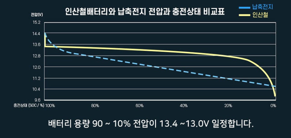 ✔ 리튬 배터리는 동일한 용량이라도 납산 배터리보다 더 오래 사용할 수 있습니다!