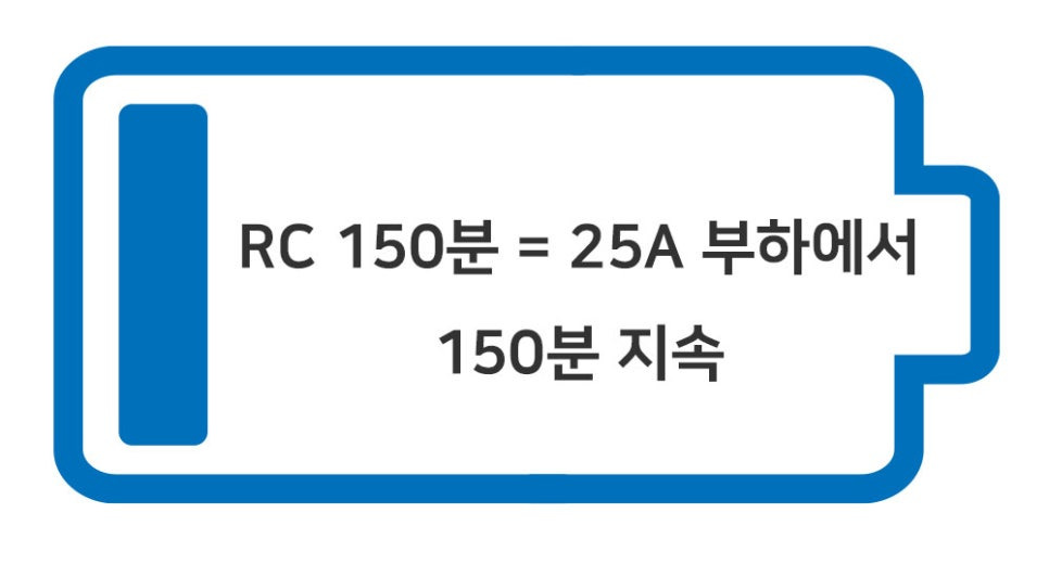 예를 들어, 예비 용량이 150분인 배터리는 25A(암페어)의 부하를 연결했을 때 전압이 10.5V 이하로 떨어지기 전까지 150분 동안 사용할 수 있다는 뜻입니다.