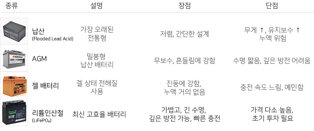 12V 배터리는 종류별로 구조, 가격, 수명, 유지보수에 큰 차이가 있습니다.