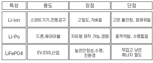 ● 단점: 고온 환경에서 불안정 / 과충전 시 발화 가능