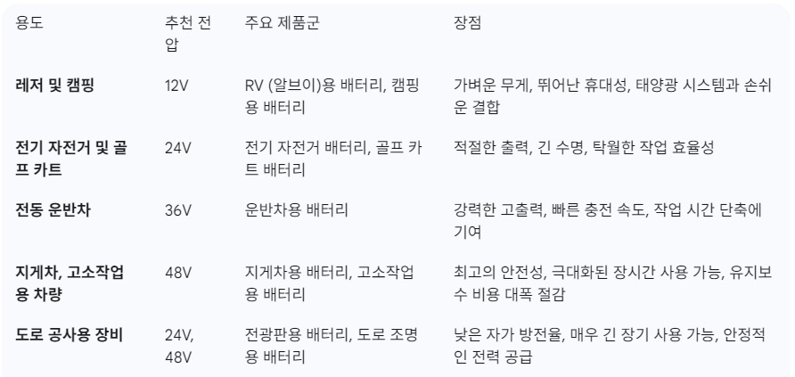 - 주요 용도: RV, 캠핑 장비, 소형 전자기기, 태양광 가로등, 선박 CCTV, 소형 모빌리티