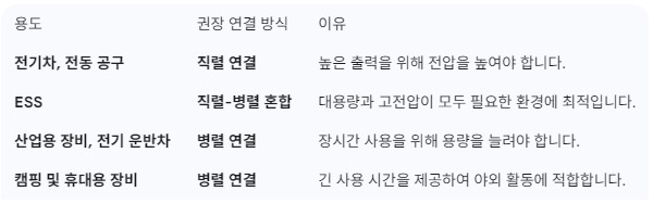 -BMS 필수: 직렬 연결, 병렬 연결, 혼합 연결 방식 모두 **BMS(Battery Management System)**가 필수적입니다. 셀 불균형이나 과충전·과방전으로 인한 손상을 방지하기 위해 BMS가 필요합니다.