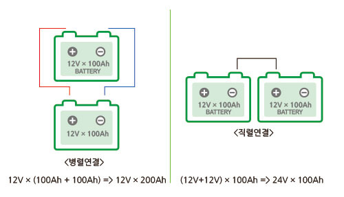 -예시: 12V, 100Ah 배터리 2개를 직렬 연결하면, 결과는 24V, 100Ah가 됩니다.