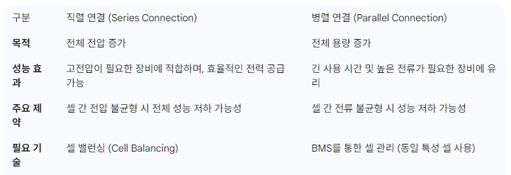 -제약: 전류 불균형이 발생할 수 있으므로, 동일한 특성의 셀을 사용하고 BMS를 통해 관리해야 합니다.