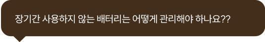 A8: 장기간 미사용 시 40-60% 정도로 충전한 상태에서 서늘한 실내에 보관합니다. 6개월마다 전압을 점검하고, 자가 방전으로 인해 전압이 낮아졌다면 약간 충전하여 유지하는 것이 좋습니다.