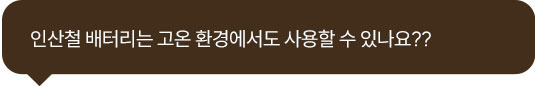 A4: 인산철 배터리는 고온에 대한 내구성이 뛰어나지만, 60°C 이상의 온도에서는 배터리 수명이 줄어들 수 있습니다. 직사광선이 닿는 곳이나 차량 내부처럼 온도가 높아질 수 있는 환경에서는 사용을 피하고, 실내 또는 서늘한 곳에서 사용 및 보관하는 것이 좋습니다.