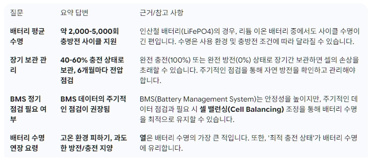 A9: BMS가 탑재된 배터리팩은 셀 간 전압, 전류, 온도를 모니터링해 안정적으로 작동하지만, 주기적으로 BMS 데이터를 점검하는 것이 좋습니다. BMS의 상태를 확인하고 필요 시 셀 밸런싱을 조정하여 배터리 수명을 더욱 연장할 수 있습니다.