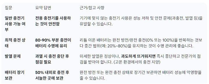 A3: 충전 중 미세한 발열은 정상적입니다. 그러나 배터리가 과도하게 뜨거워지거나, 배터리 표면이 손으로 만질 수 없을 정도로 과열된다면 충전을 즉시 중단하고 점검이 필요합니다. 고온 환경에서 충전 시에는 열 축적이 발생할 수 있으니, 실내 온도를 유지하며 충전하는 것이 좋습니다.