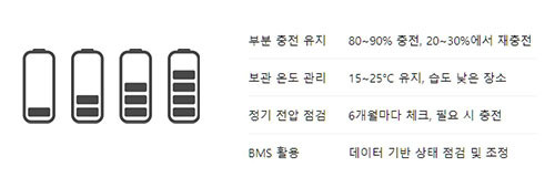 완전 충전보다는 부분 충전을 통해 배터리 화학 반응을 안정적으로 유지하고, 20-30% 상태에서 충전하는 것이 수명을 연장하는 데 도움이 됩니다.
