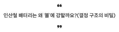 연료(산소)가 없으니 불이 붙기 매우 어려운 구조인 것이죠. 이것이 인산철 배터리가 화재에 강한 과학적인 이유입니다.